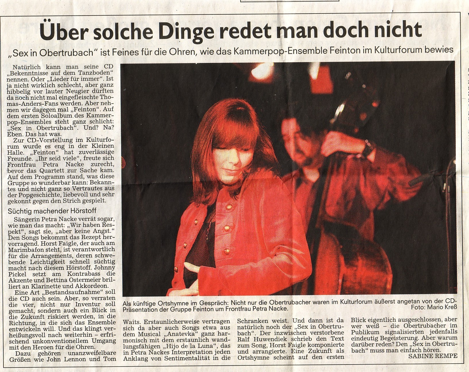 »Feinton« stochert abseits der großen Hits und läßt das Publikum gern schon einmal grübeln, was die Song-Herkunft anbelangt. Robert Wyatts »Ship Building« ist so ein bekannter, unbekannter Song, der im Gedächtnis herumspukt und nun mit Sängerin Petra Nacke wieder anspringt im Kopf. Pop-Sperrgut und Beinah-Evergreens aus dem Grenzbereich, wo Zuhören die Ohren noch schärft und Zwischentöne das Sagen haben. (Nürnberger Nachrichten 2003)